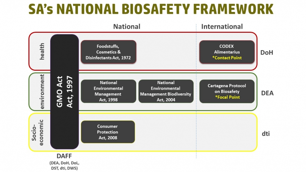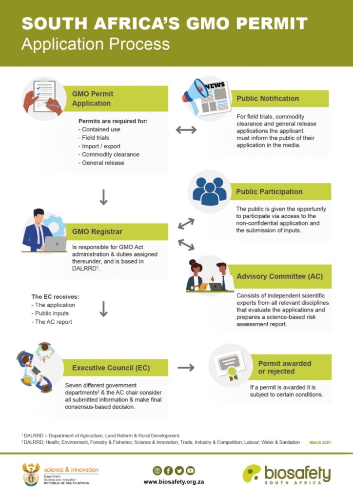 All activities with GMOs in South Africa are primarily regulated under the GMO Act. This includes research and development, import/export, production, consumption and other uses of GMOs and their products. The GMO Act establishes minimum standards to ensure the food/feed and environmental safety and socio-economic sustainability of all activities involving GMOs.